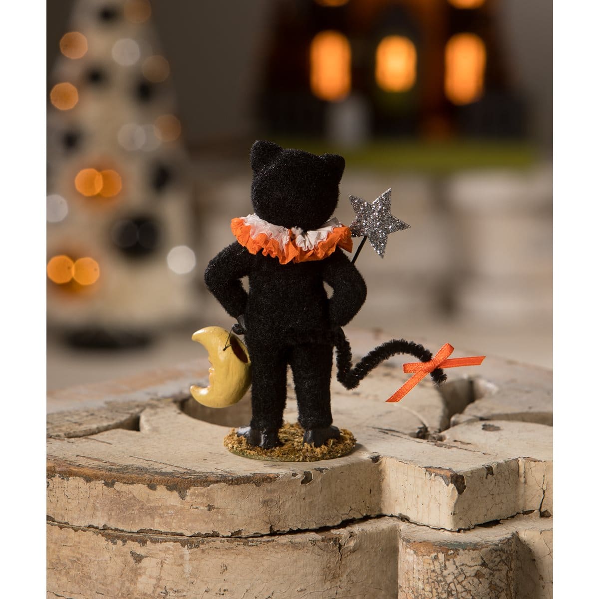 Dare to be different with Cali, the cat who knows how to have fun! Dressed in a stylish black and white catsuit, she shows confidence and flair. With a starry wand in one hand and a moon bucket in the other, she is ready to embark on a Halloween adventure with you. The Dressed Up Cali Cat effortlessly complements any Halloween-themed display, bringing a sense of joy and excitement. Whether placed on a mantel, table, or shelf, Cali adds a lovalbe touch that will make your guests smile. Her presence is sure to spark conversations and create lasting memories.
