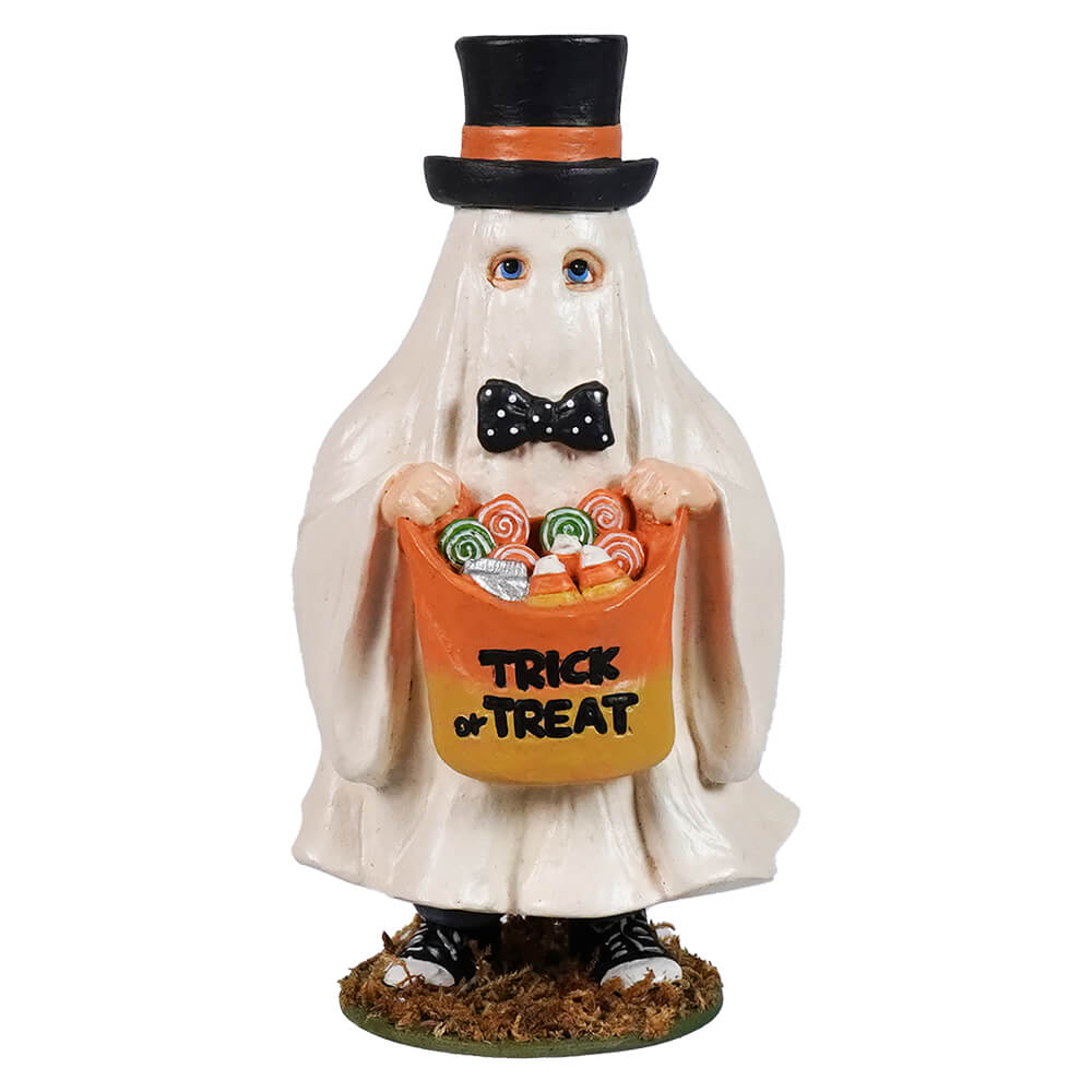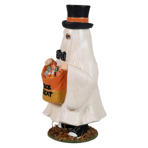 In his hand, Cullen clutches an orange trick-or-treat bag overflowing with candy — proof that he's already mastered the art of charming the neighbors. Whether he's creeping across your mantel or standing guard by the candy dish, Ghostie Cullen Boy is sure to bring a sweet and spooky touch to your Halloween display.