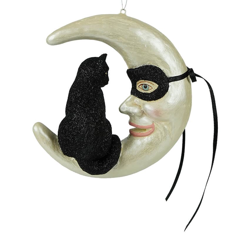At the center of this delightful ornament is a cute black cat perched on a crescent moon. The cat's mesmerizing gaze is fixed on the moon's masked face, creating a playful scene. The hand-painted pearl finish of the moon adds an elegant touch, while the black glitter on the cat contrasts beautifully, adding a hint of sparkle and magic.