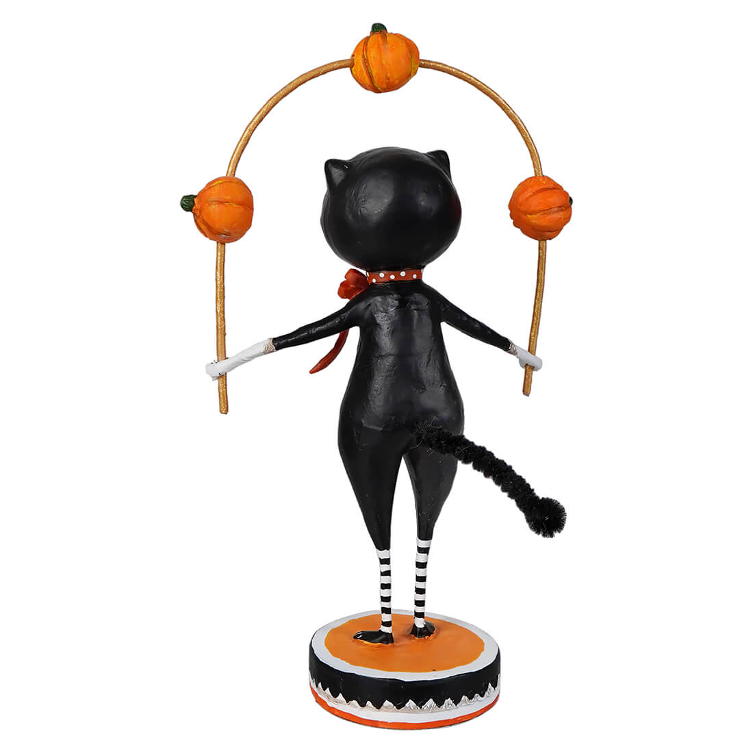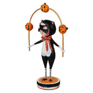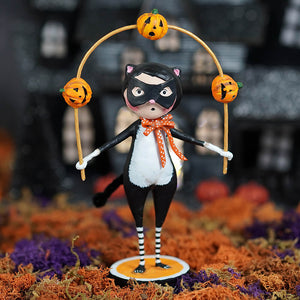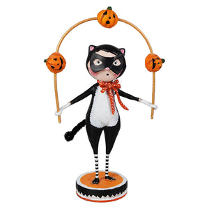 From her black-and-white feline ensemble to the cheerful orange pumpkins twirling in her hands, every detail of this figure captures the fun and energy of Halloween. Whether she’s practicing her act for a spooky soirée or just showing off for a gathering of ghouls, she brings a lively touch to any autumn display. Her striped stockings and tiny button nose only add to the festive charm—because let’s face it, a juggling cat is something you don’t see every day!